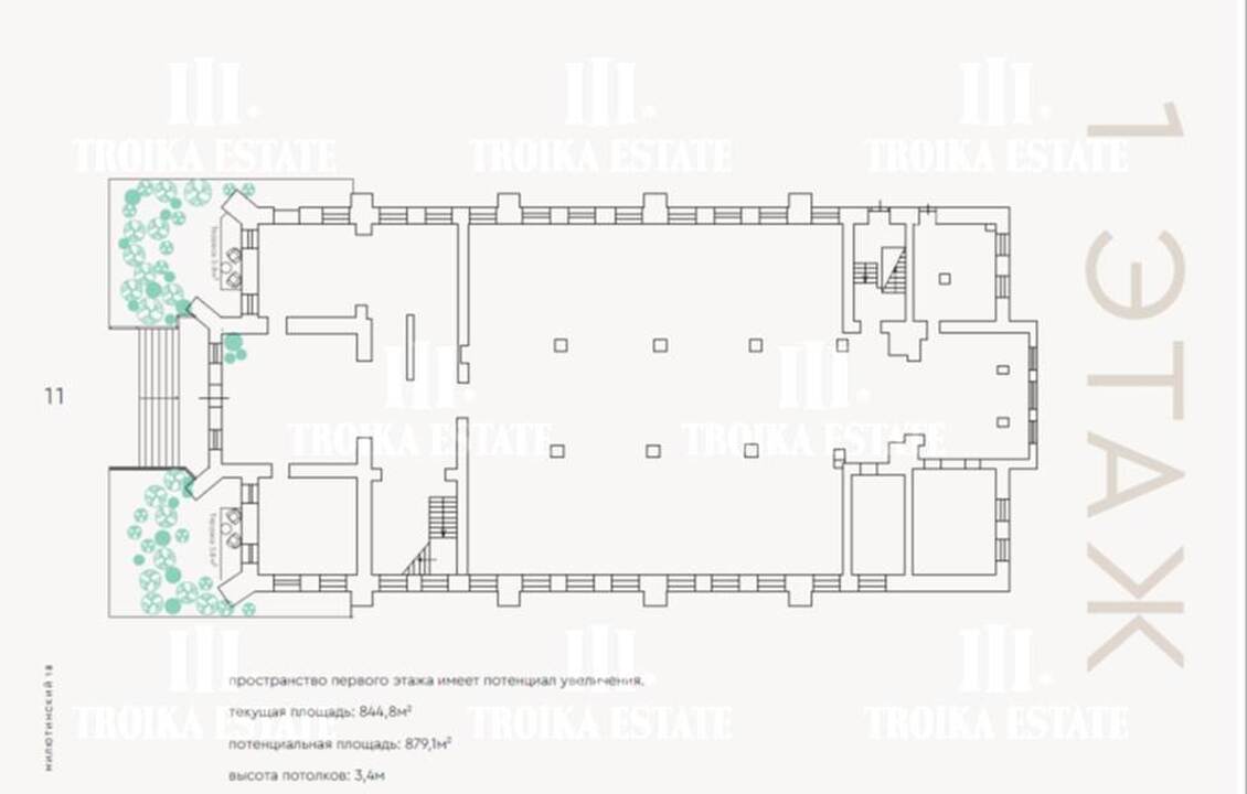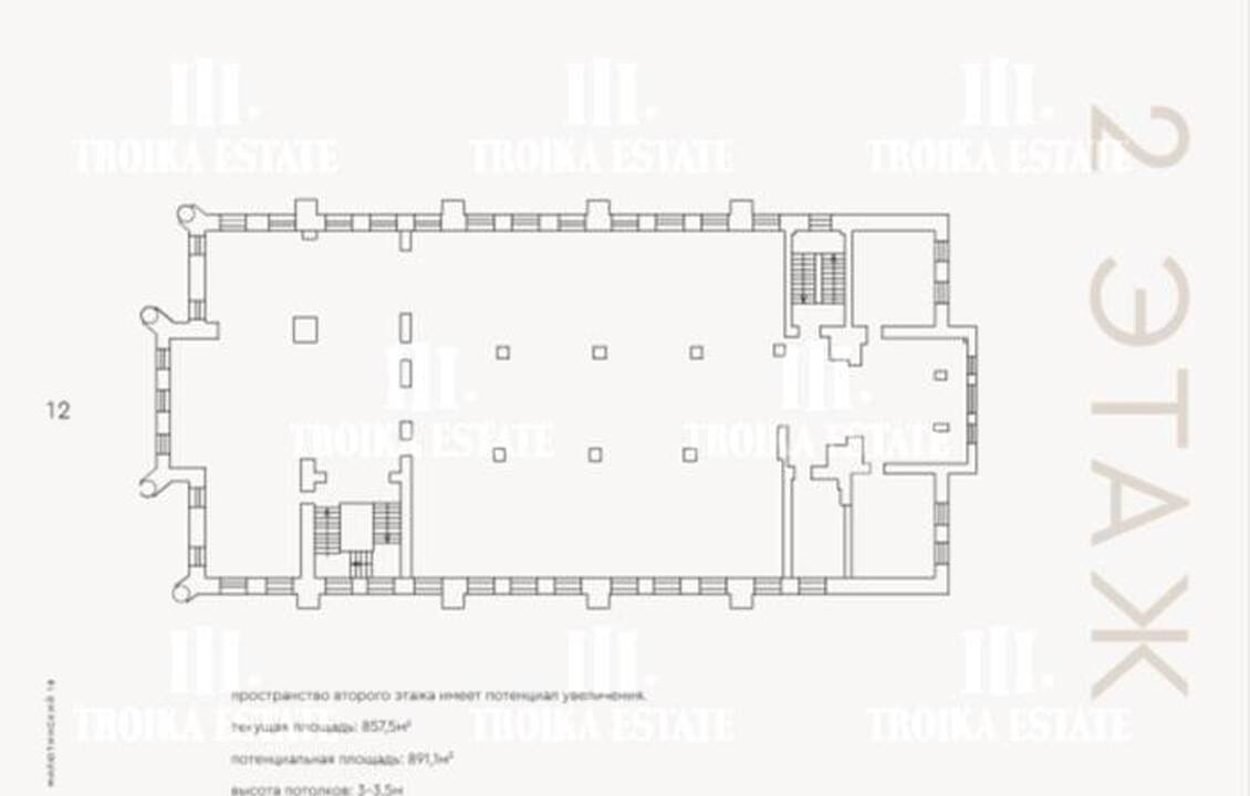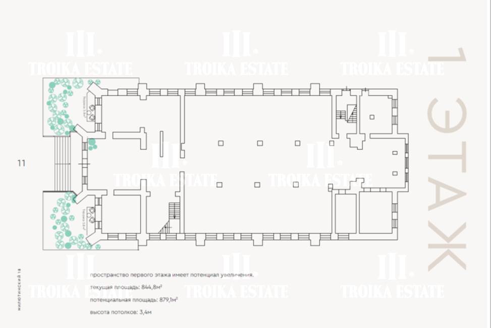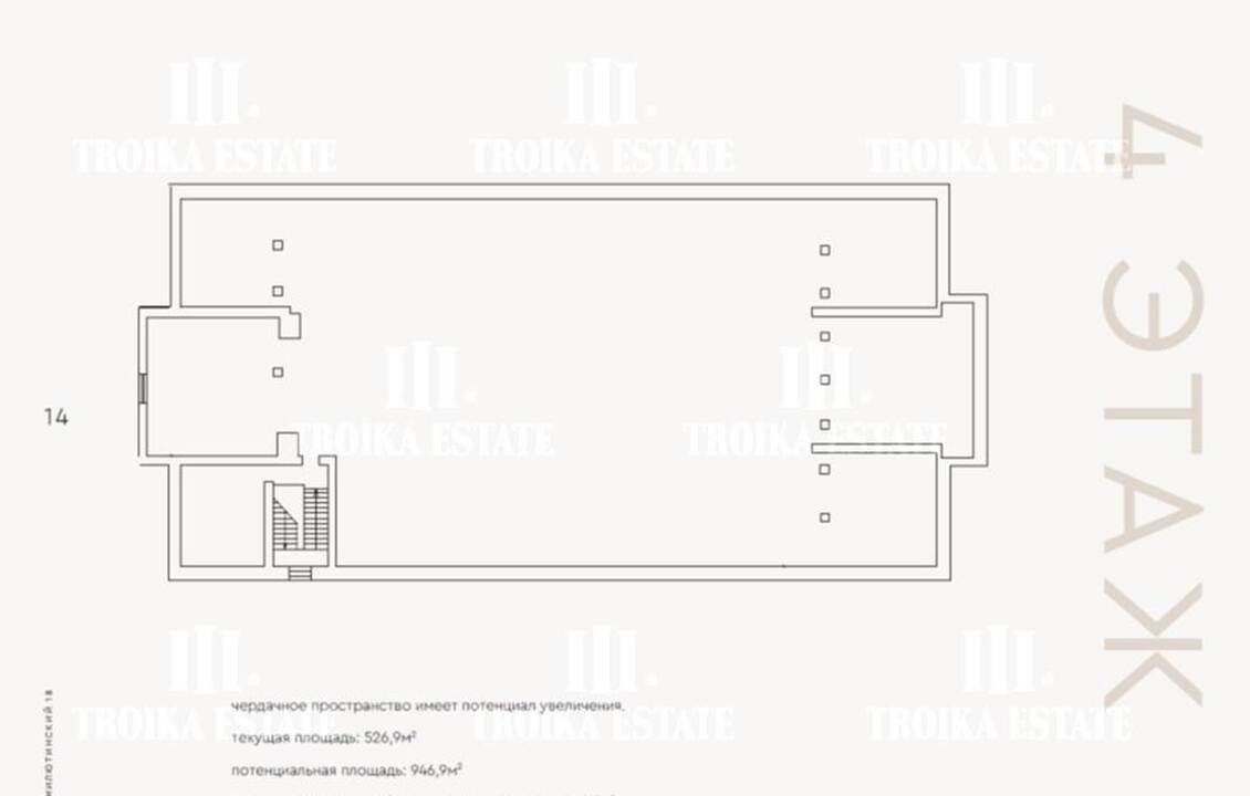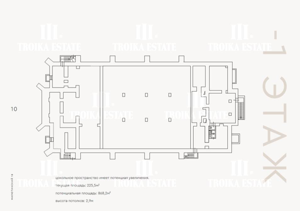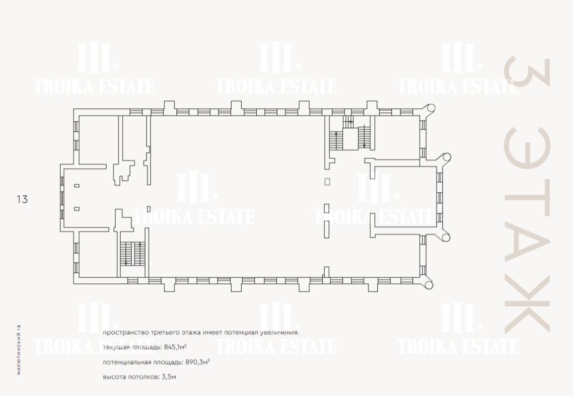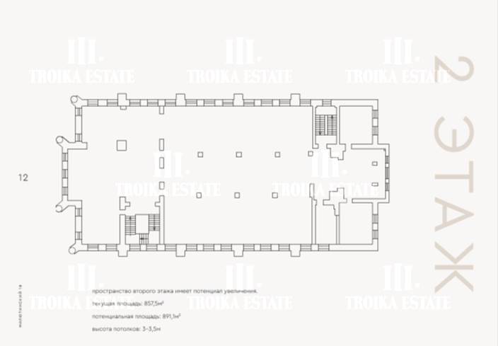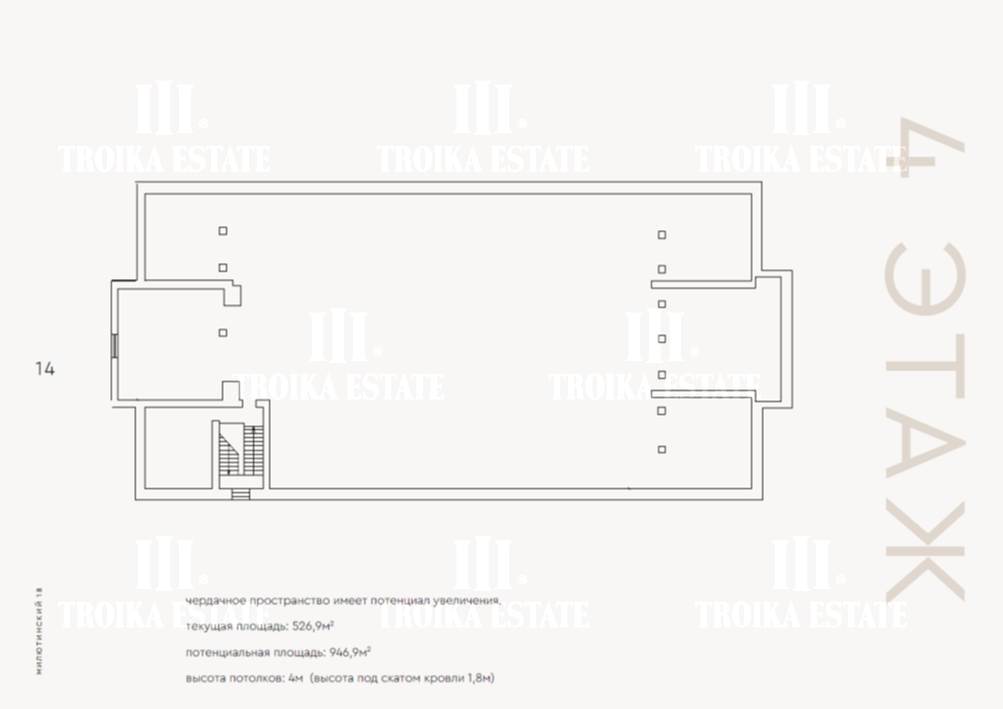 3 299,8 м² (3 этажа, подвал, чердак). Потолки - 3,4 м, виды в тихий внутренний двор.