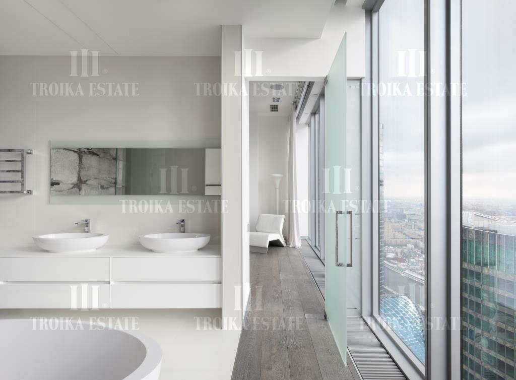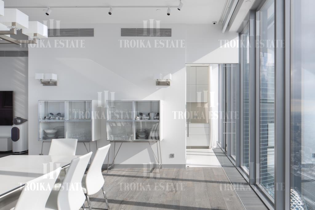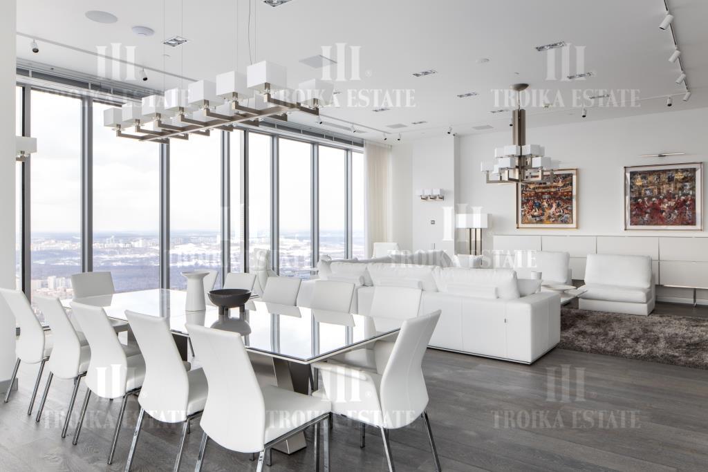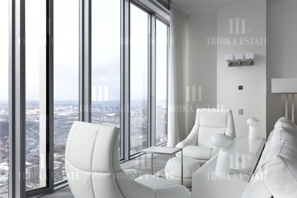 Роскошный видовой пентхаус на 80-м этаже с изысканным интерьером в светлых тонах. Видовая панорама полностью открыта и не загораживает высотными зданиями виды в сторону МГУ, Новодевичьего монастыря и Гребного канала. Все комнаты ориентированы на солнечную сторону (юг и юго-восток), поэтому жилое пространство всегда заполнено солнечным светом. Ремонт выполнен в современном стиле профессиональными дизайнерами. Гармоничный и теплый белый цвет подчеркивает ту великолепную перспективу, которая открывается из окон. Пентхаус укомплектован всем необходимым для проживания. В отделке использованы брендовые материалы. Мебель и техника таких премиальных марок как FORMITALIA, FORMERIN, DRAENERT, DEMA, POGGENPOHL, GAGGENAU, V-ZAG, ANTONIOLUPI, NEBULA, FLOS. Полы выложены брошированной дубовой паркетной доской VIDEBOISTERRADOMBRA. Установлена система умный дом, в том числе датчик солнца на жалюзи.