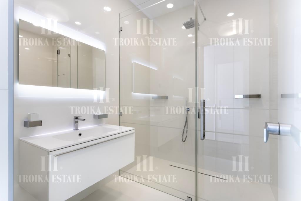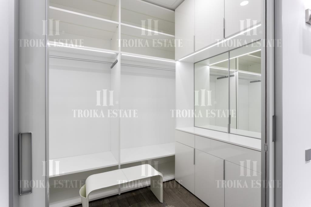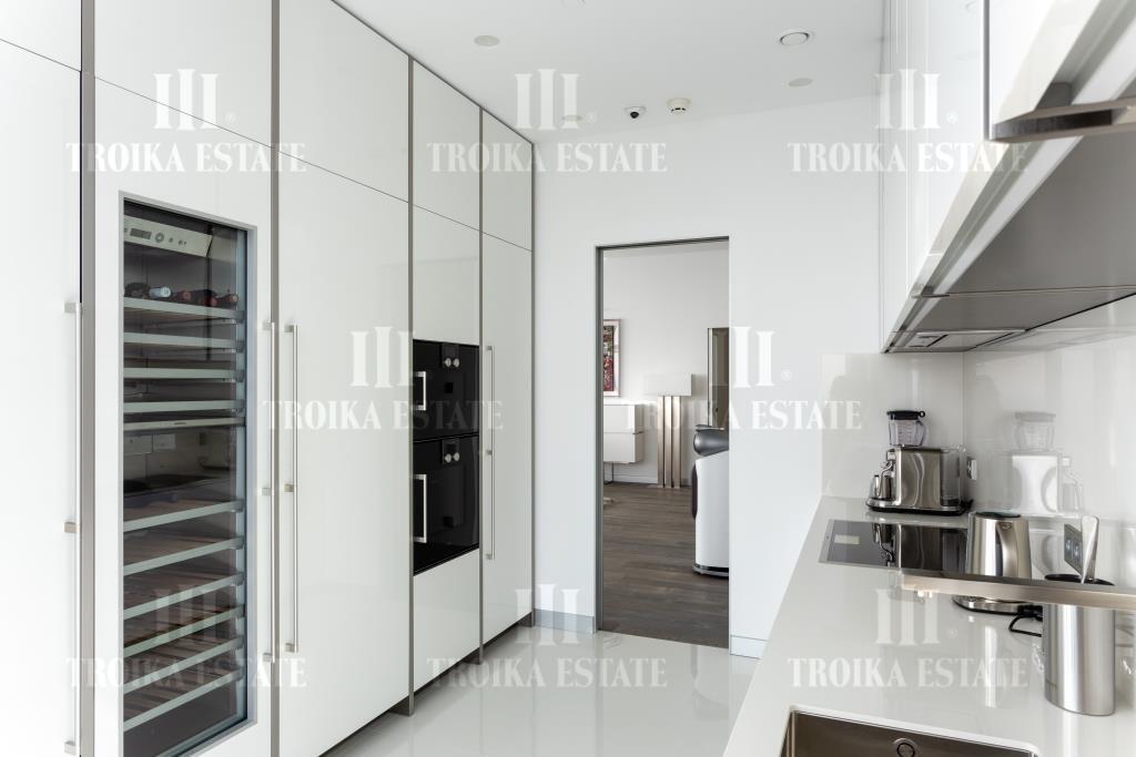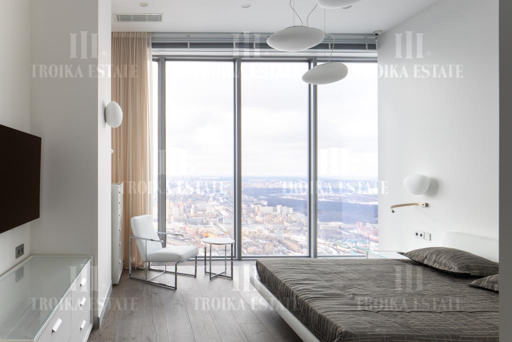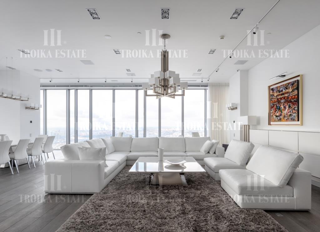 Роскошный видовой пентхаус на 80-м этаже с изысканным интерьером в светлых тонах. Видовая панорама полностью открыта и не загораживает высотными зданиями виды в сторону МГУ, Новодевичьего монастыря и Гребного канала. Все комнаты ориентированы на солнечную сторону (юг и юго-восток), поэтому жилое пространство всегда заполнено солнечным светом. Ремонт выполнен в современном стиле профессиональными дизайнерами. Гармоничный и теплый белый цвет подчеркивает ту великолепную перспективу, которая открывается из окон. Пентхаус укомплектован всем необходимым для проживания. В отделке использованы брендовые материалы. Мебель и техника таких премиальных марок как FORMITALIA, FORMERIN, DRAENERT, DEMA, POGGENPOHL, GAGGENAU, V-ZAG, ANTONIOLUPI, NEBULA, FLOS. Полы выложены брошированной дубовой паркетной доской VIDEBOISTERRADOMBRA. Установлена система умный дом, в том числе датчик солнца на жалюзи.