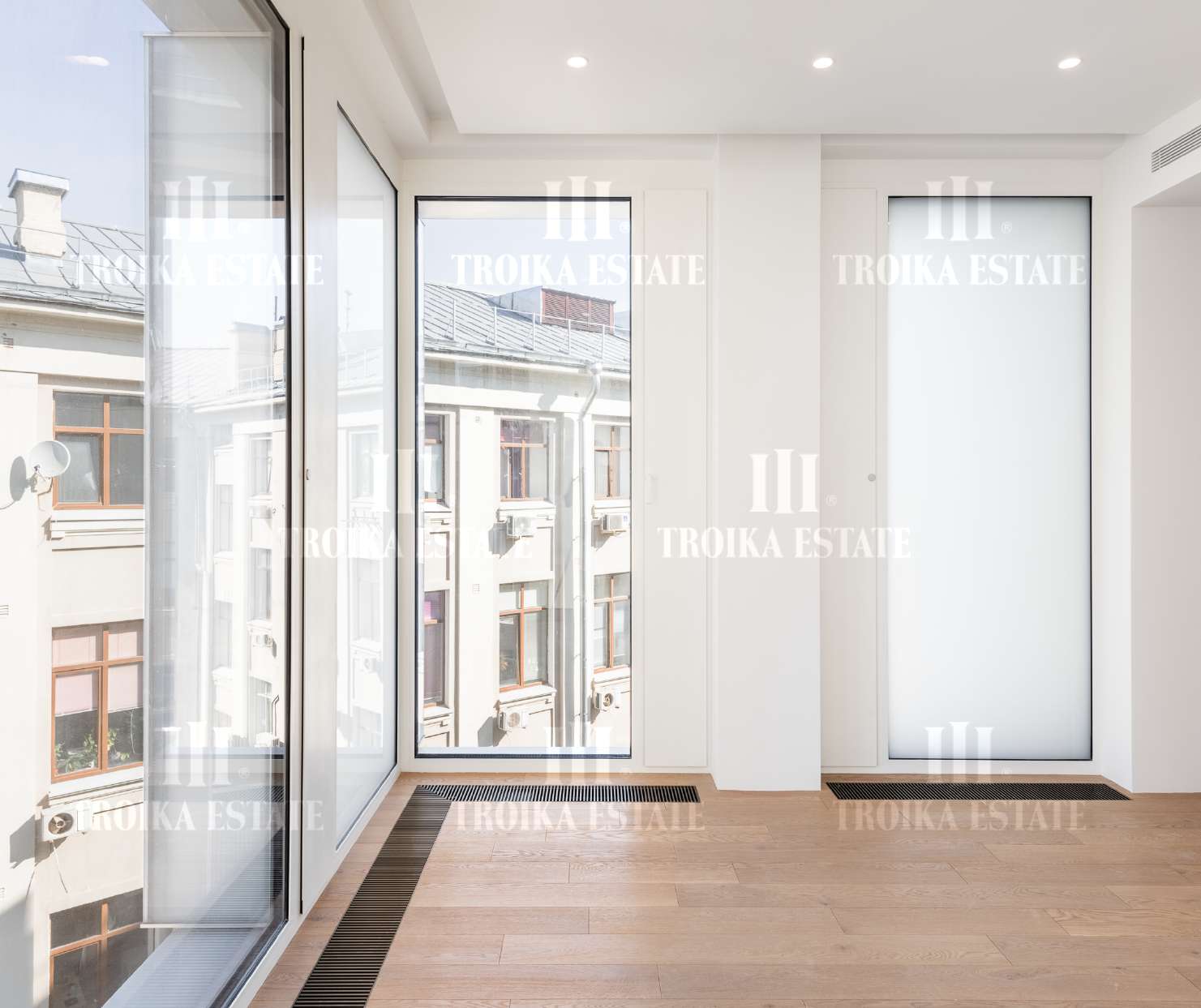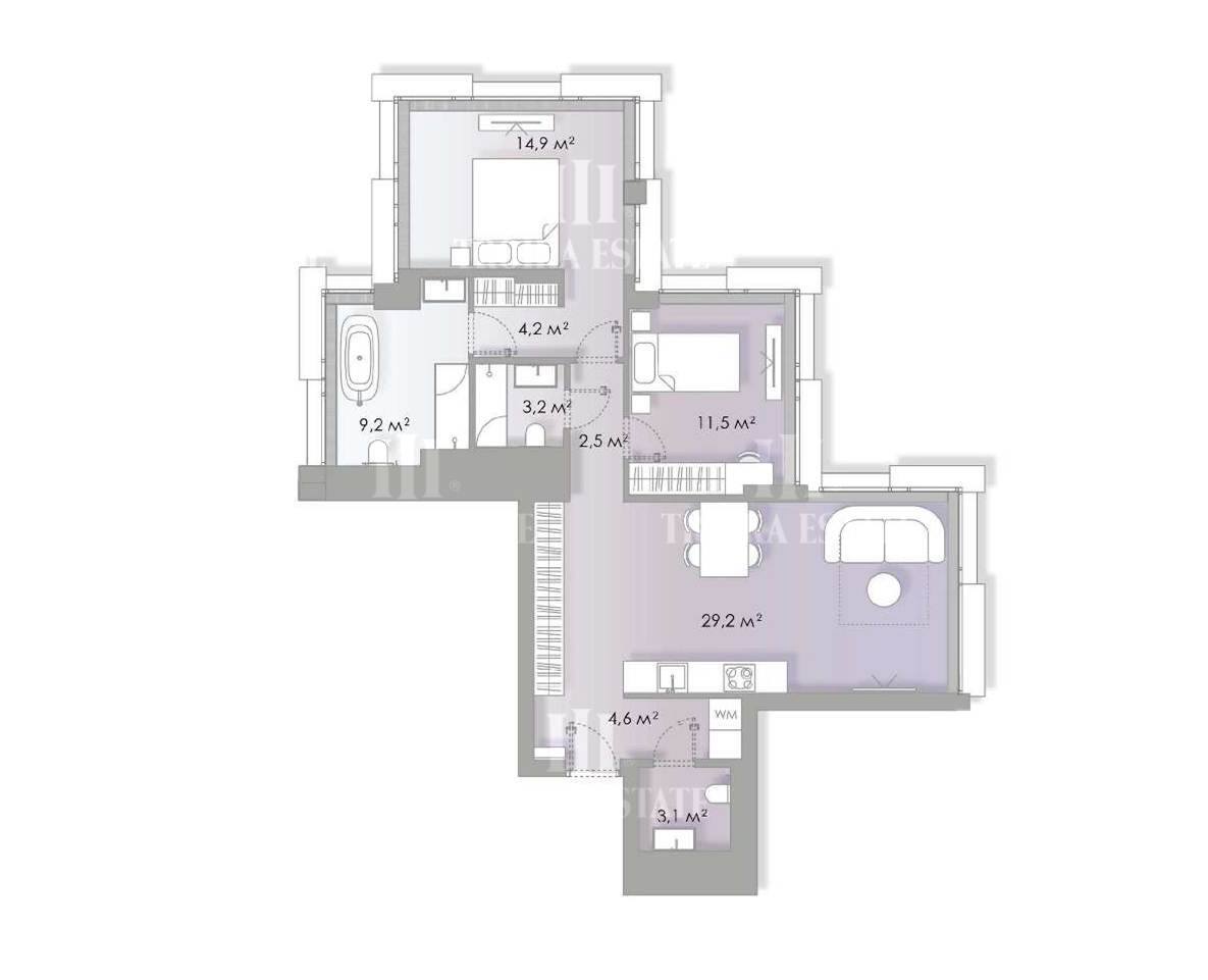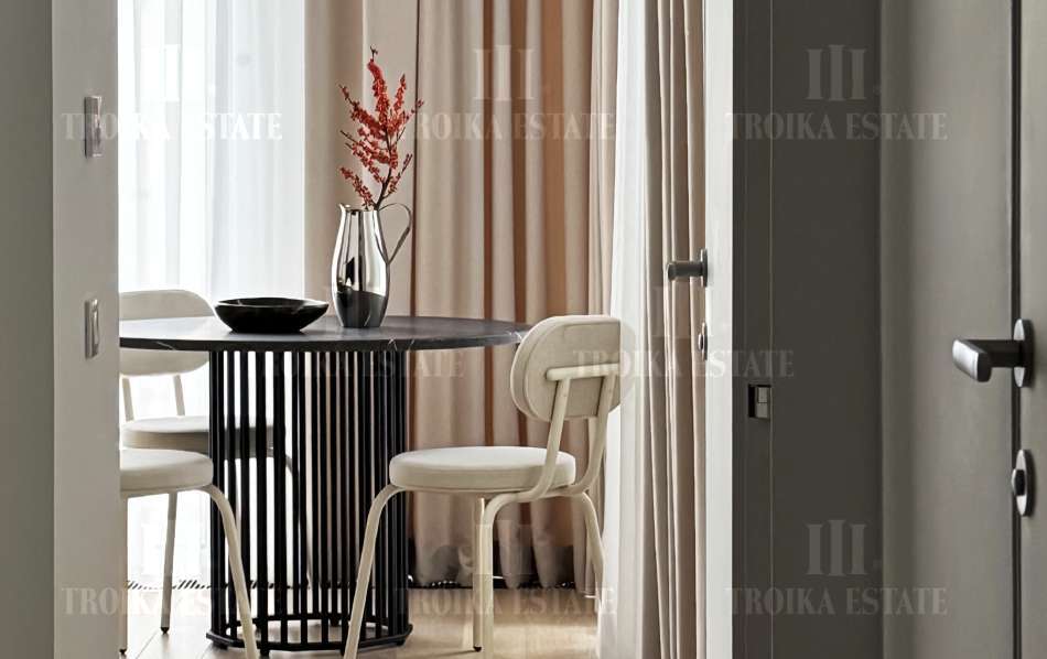 Трехкомнатный апартамент с финишной отделкой. Выполнены отделочные и инженерные работы под ключ: покраска стен и потолков в комнатах, укладка инженерной доски, межкомнатные двери скрытого монтажа, встраиваемые потолочные светильники, установка розеток и выключателей, установка внутрипольных конвекторов с декоративной решеткой, установка решеток вентиляции, керамическая плитка в санузлах, сантехника. Максимальная освещенность апартамента достигается за счёт семи панорамных окон выстой 2,8 метра. Высота потолков - 3 метра. Светлая просторная кухня-гостиная полностью укомплектована мебелью и техникой. В приватном блоке располагается мастер-спальня с ванной комнатой и гардеробной, детская спальня с санузлом.