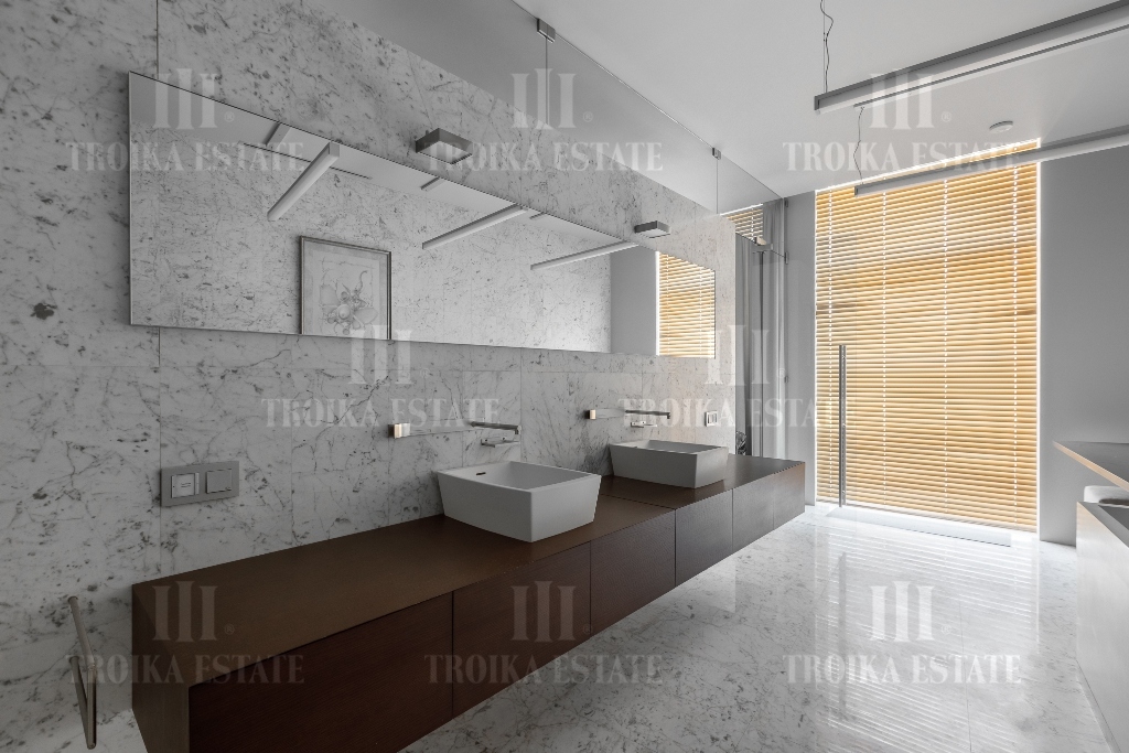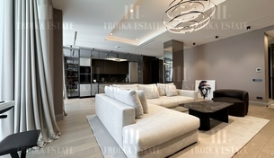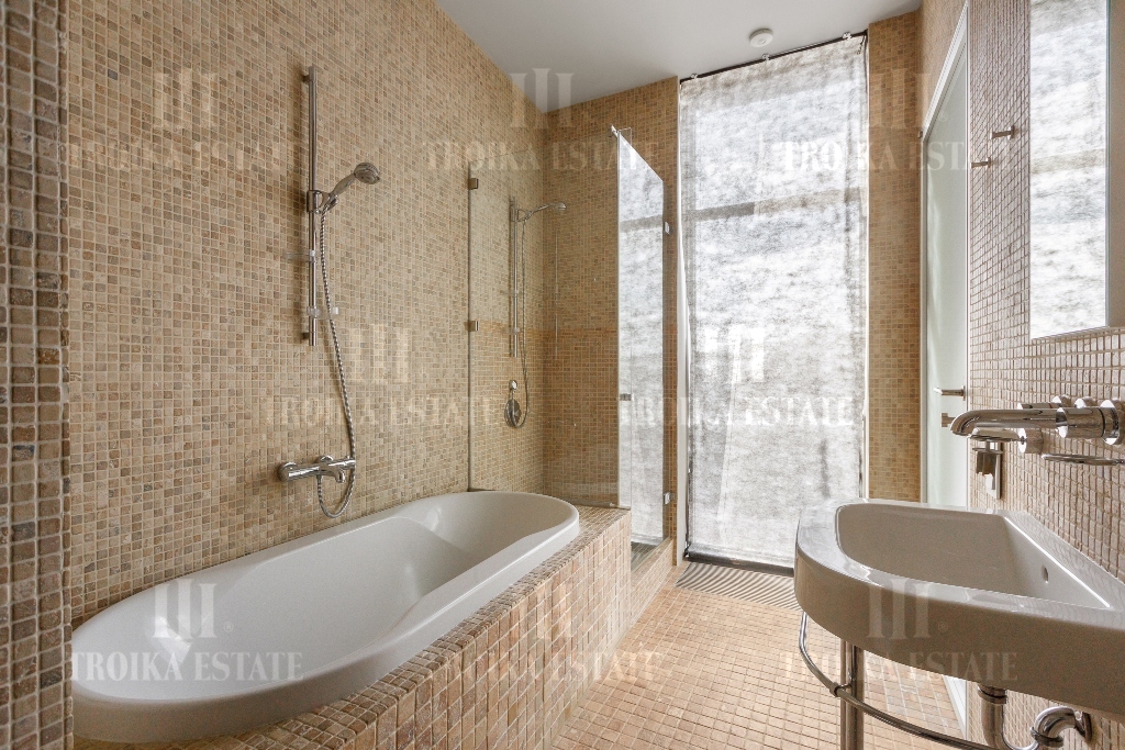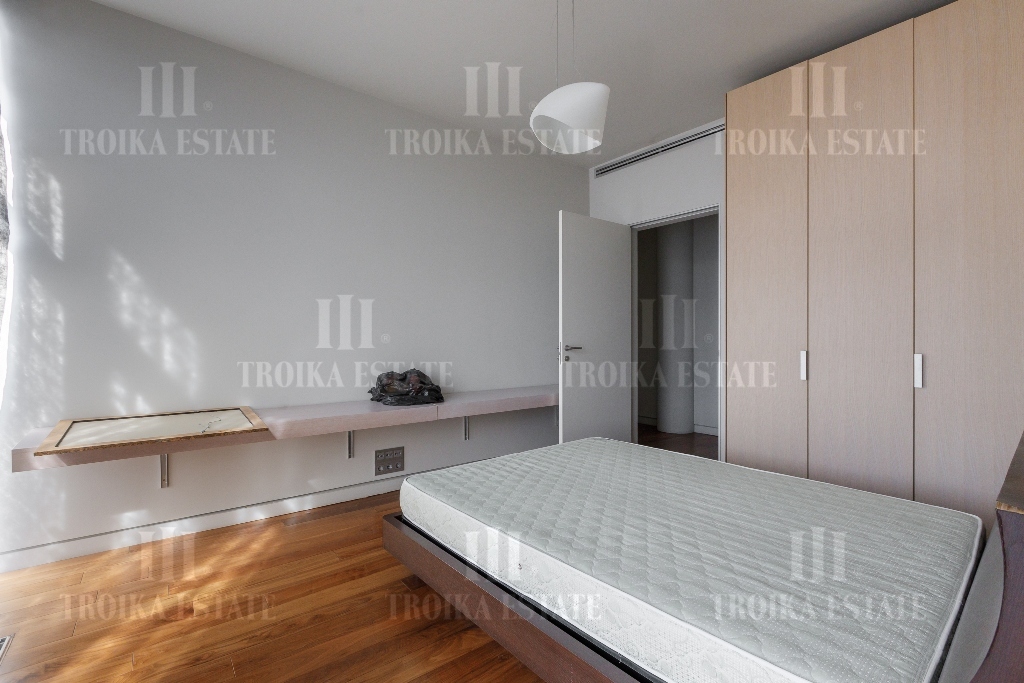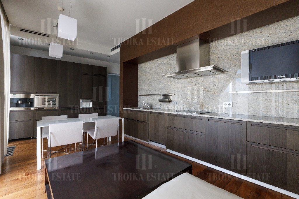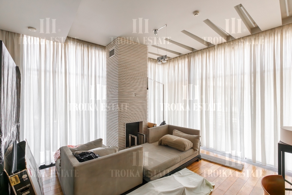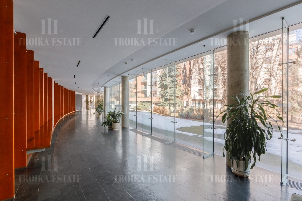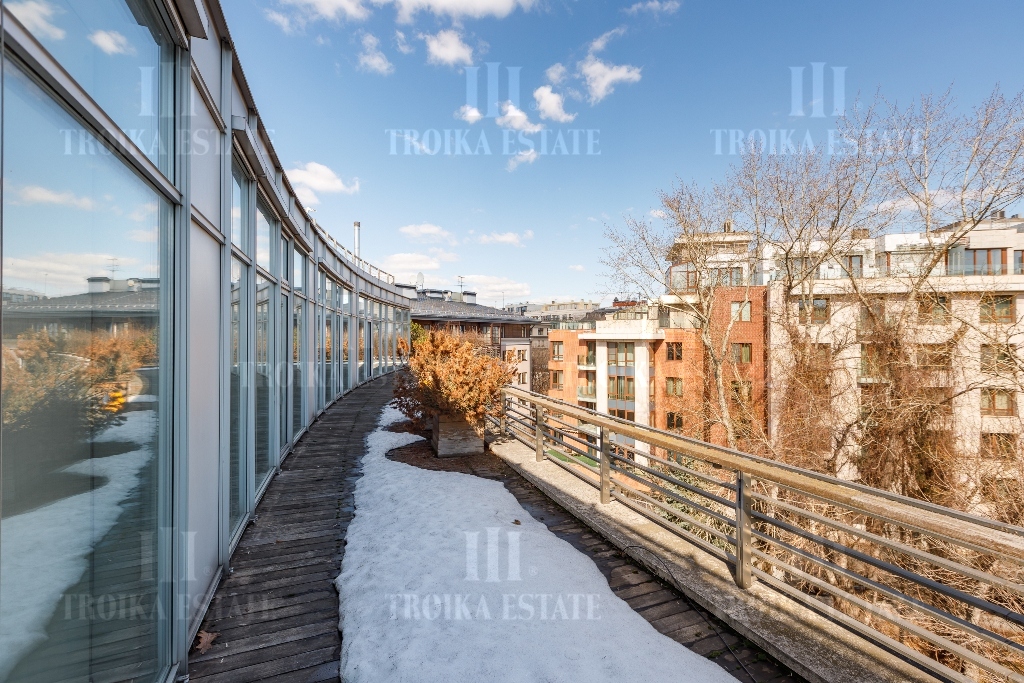 Пентхаус с видовой террасой в малоэтажном современном особняке в центре Москвы. Выполнена отделка, требующая обновления. Пентхаус занимает весь этаж, лифт приходит персонально в квартиру. Предусмотрено 2 м/м в подземном паркинге. Планировочное решение функционально выделяет гостевую и приватную зоны. Просторная гостиная соединена с кабинетом и кухней-столовой. В кабинете установлен действующий камин. Кухня полностью оборудована мебелью и бытовой техникой, предусмотрена система очистки воды. Приватная зона отделена коридором, здесь находятся три спальни, каждая со своей гардеробной и ванной комнатой, а также хозяйственные комнаты. Еще одна гардеробная и гостевой санузел расположены при входе. Из гостиной, кабинета и мастер-спальни выход на большую террасу с живописными видами.