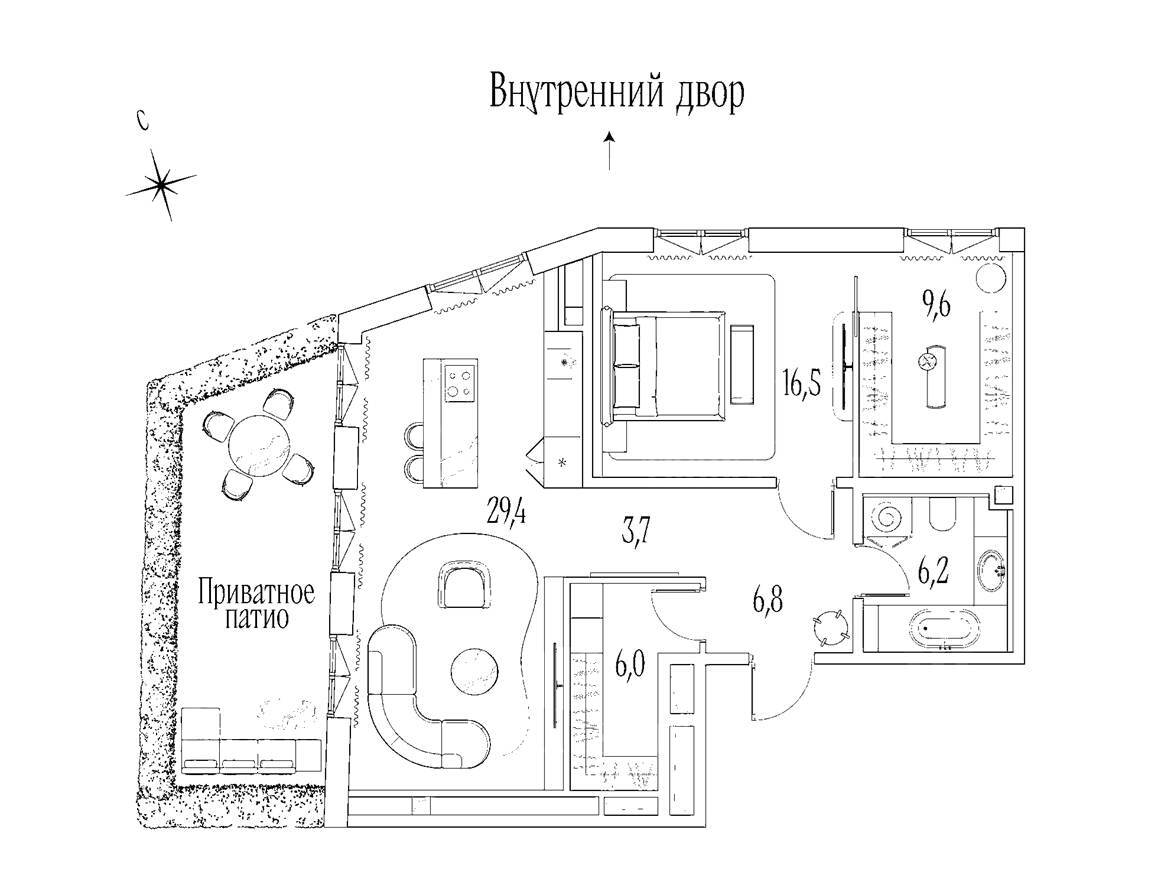 Двухкомнатная квартира без отделки с собственным патио 20 кв.м. Квартира расположена на 1-м этаже малоэтажного особняка в центре Москвы. В квартире спланирована приватная зона из спальни с гардеробной, гостевая зона с выходом в патио, совмещенный санузел и сезонная гардеробная при входе. Приватность патио обеспечивается благодаря оформлению из живой изгороди. Новый клубный дом на 9 резиденций строится в центре Золотой Мили, недалеко от Пречистенской набережной. Дом является прекрасным образцом современной архитектуры - фасад выполнен из натурального камня, парадный вход с дверью ручной работы, окна в пол, французские балконы. Предусмотрен подземный паркинг. Ключи в 2025 году!