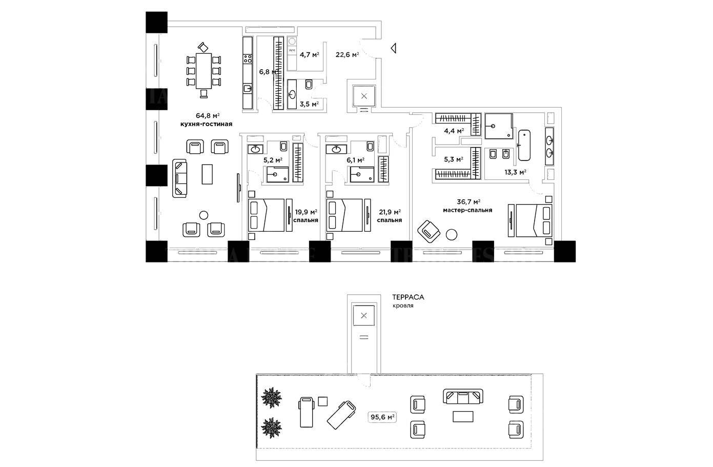 спальни с ванными комнатами и гардеробными, кухню-гостиную, гостевой санузел, постирочную, выход на эксплуатируемую кровлю.