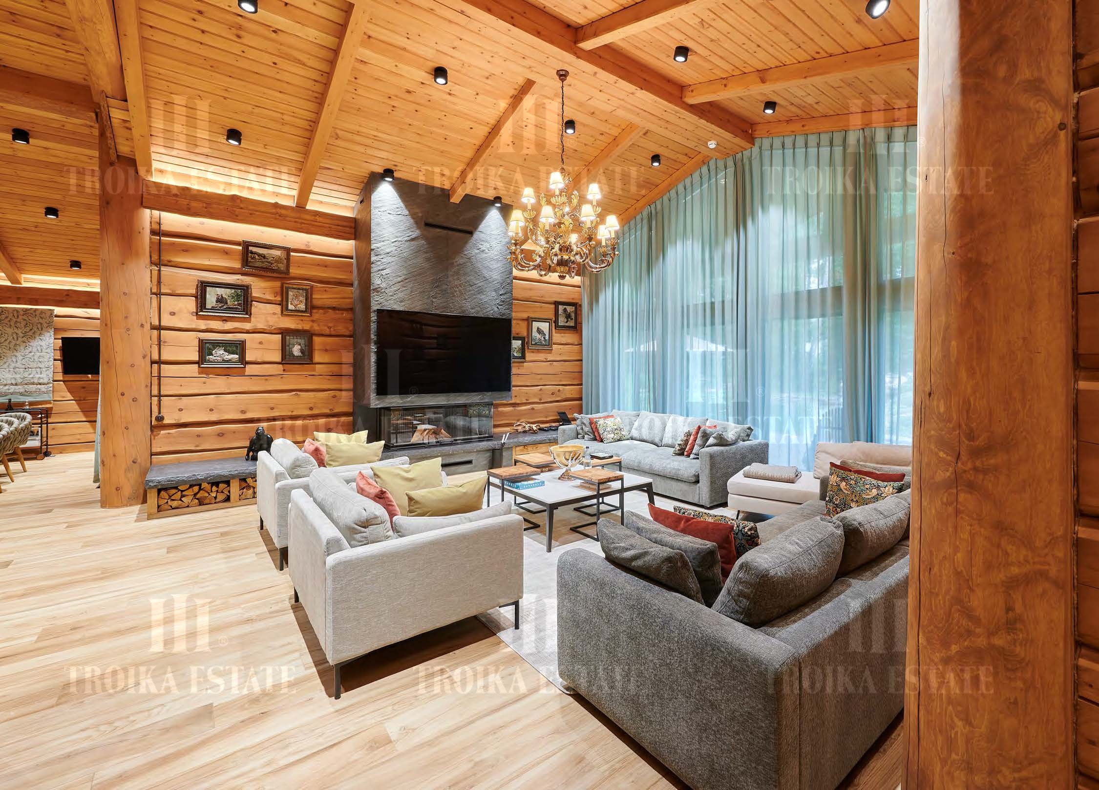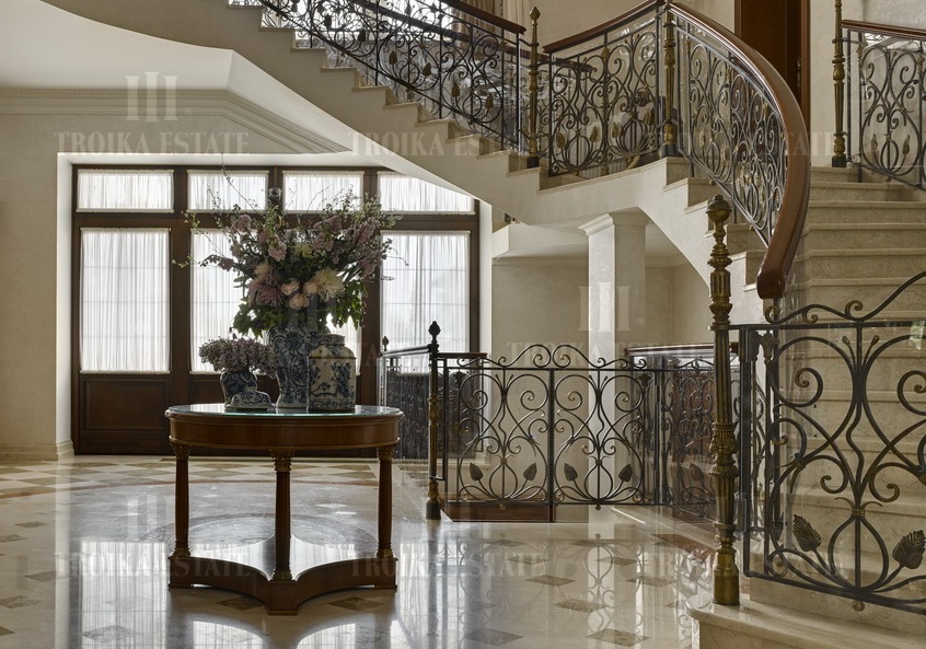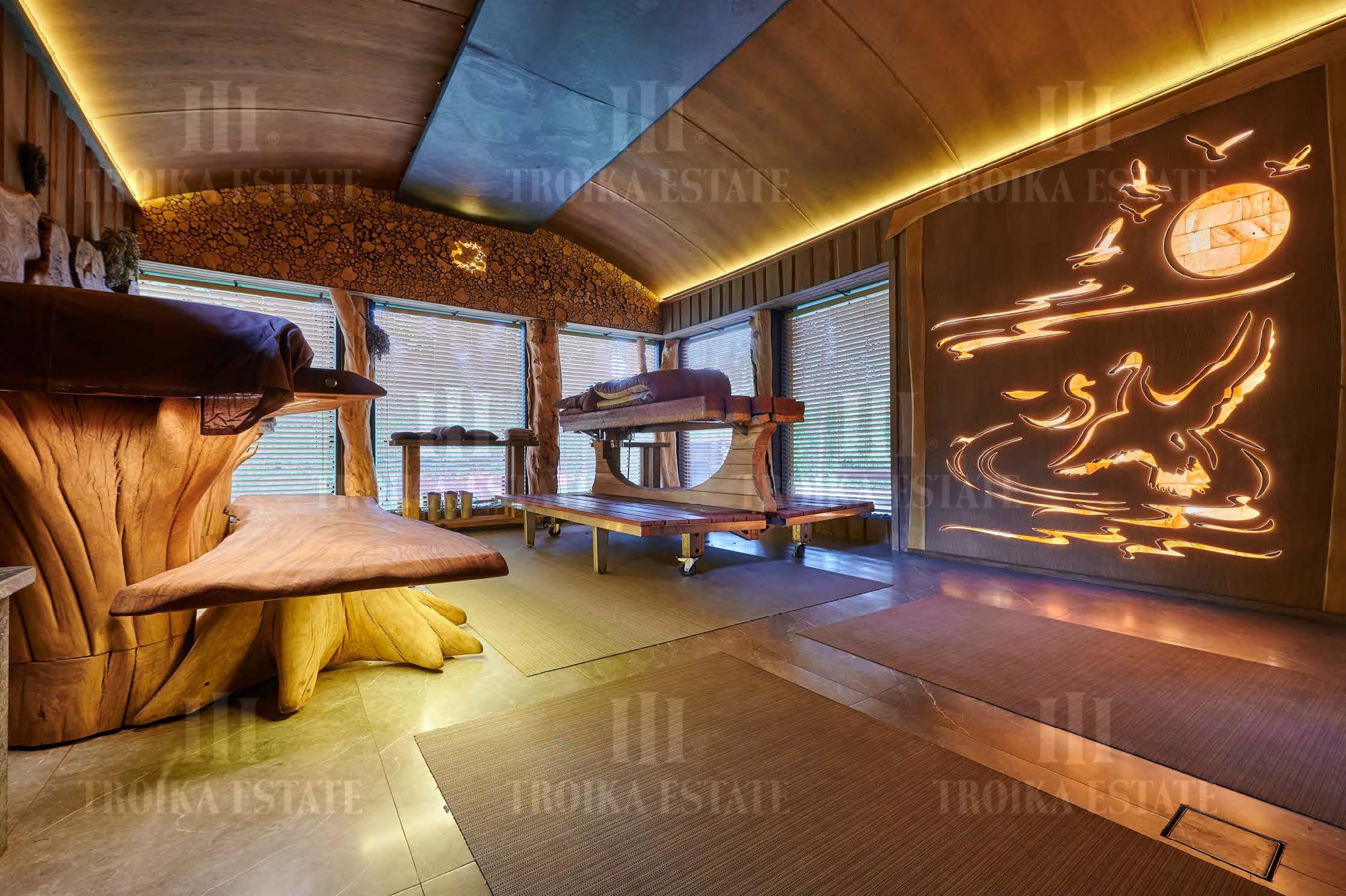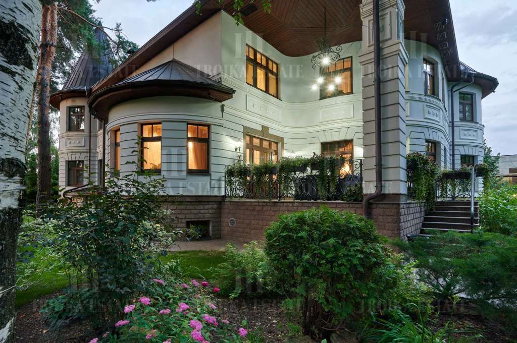 Предлагается роскошный дом на лесном участке в приватном поселке на 6 домов. В доме выполнена дизайнерская отделка в классическом стиле. Мебель российских и итальянских премиальных марок. Великолепная планировка дома включает 4 спальни со своими гардеробными и ванными комнатами, кабинет, кухню, столовую-гостиную с выходом на террасу, каминный зал, бассейн с зоной тренажеров, сауну с холодной купелью, бильярдный зал, сигарную с винотекой, салон красоты. Для автомобилей предусмотрен гараж в контуре дома, гостевая парковка, паркинг для персонала. Отдельно на участке дом для персонала, баня 350 м2, закрытая беседка с мангалом, оборудованная зона барбекю. Участок с вековыми соснами занимает 5,35 гектара, из них 32 сотки в собственности, и 5,03 гектар в аренде. В поселке работает охрана и видеонаблюдение.