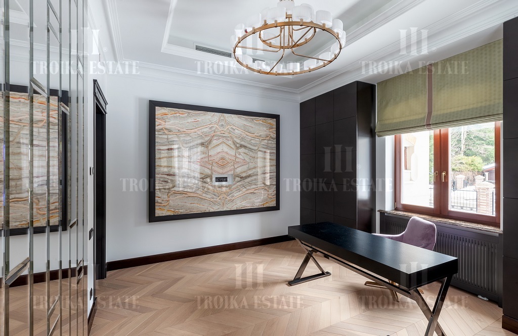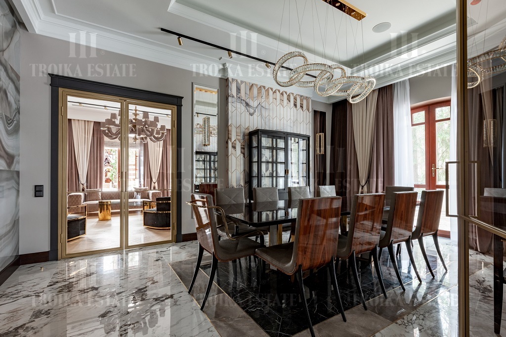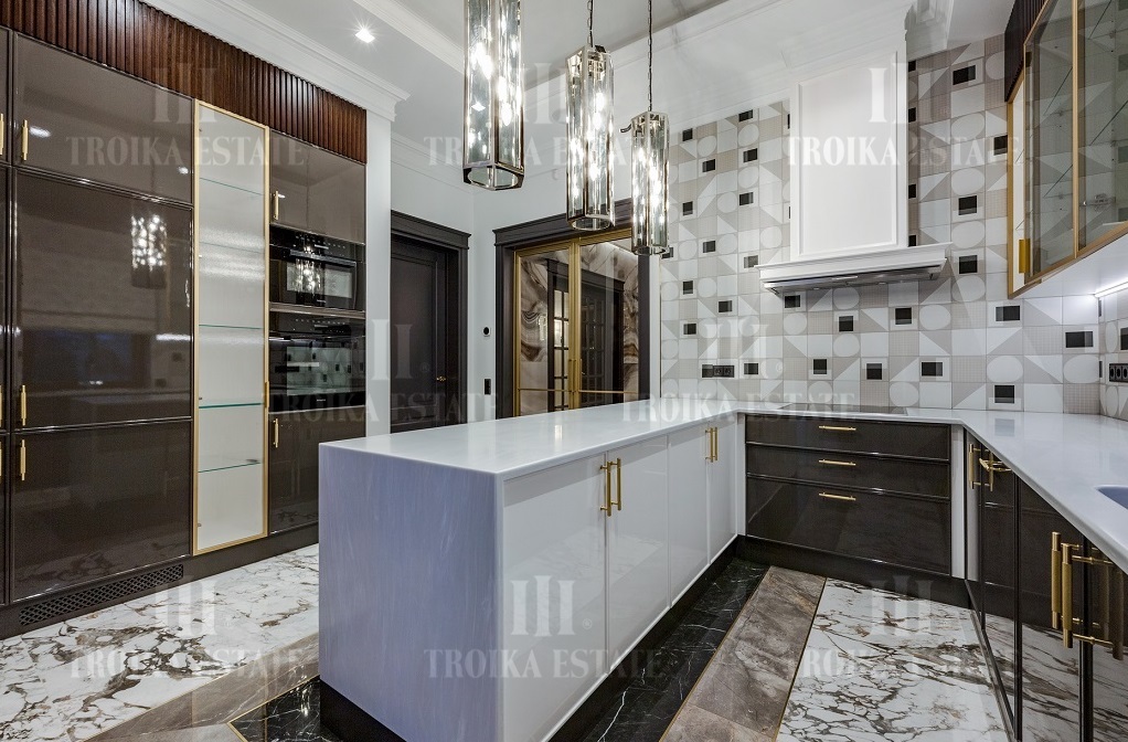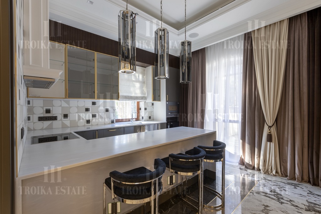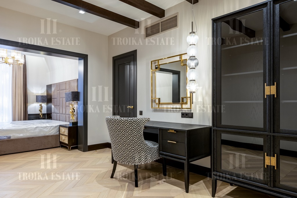 Новый дом, полностью готовый к проживанию. Дизайнерская отделка в стиле современная классика включает мебель, полностью оборудованные санузлы и кухню. В доме 3 жилых уровня. Предусмотрен гараж на 2 м/м. Планировка дома включает большую гостиную с камином, столовую, кухню, 5 спален с ванными и гардеробными, кабинет.