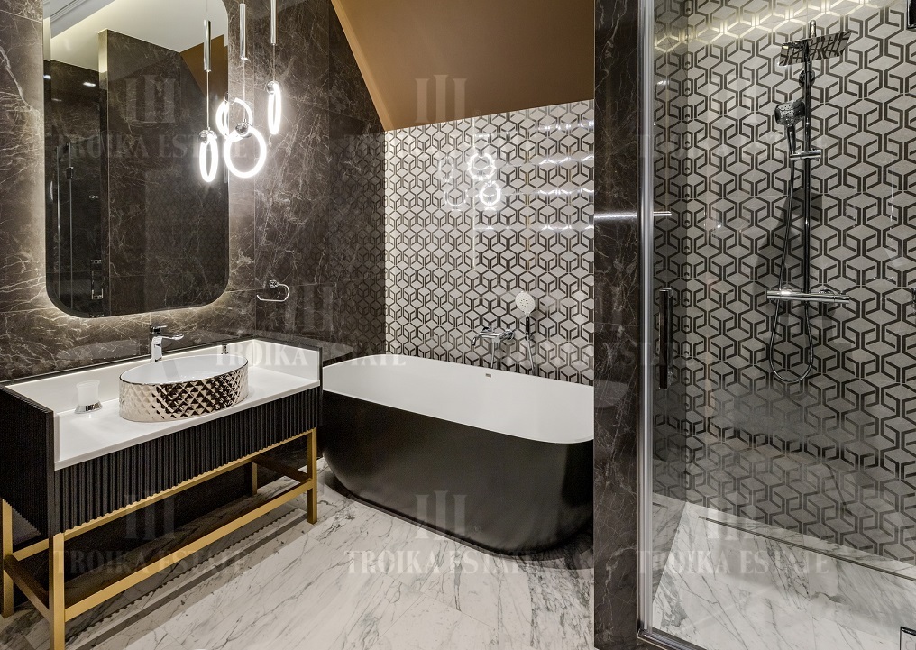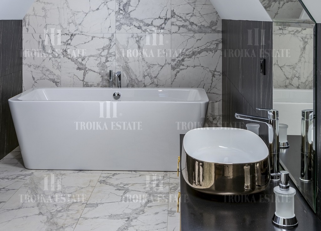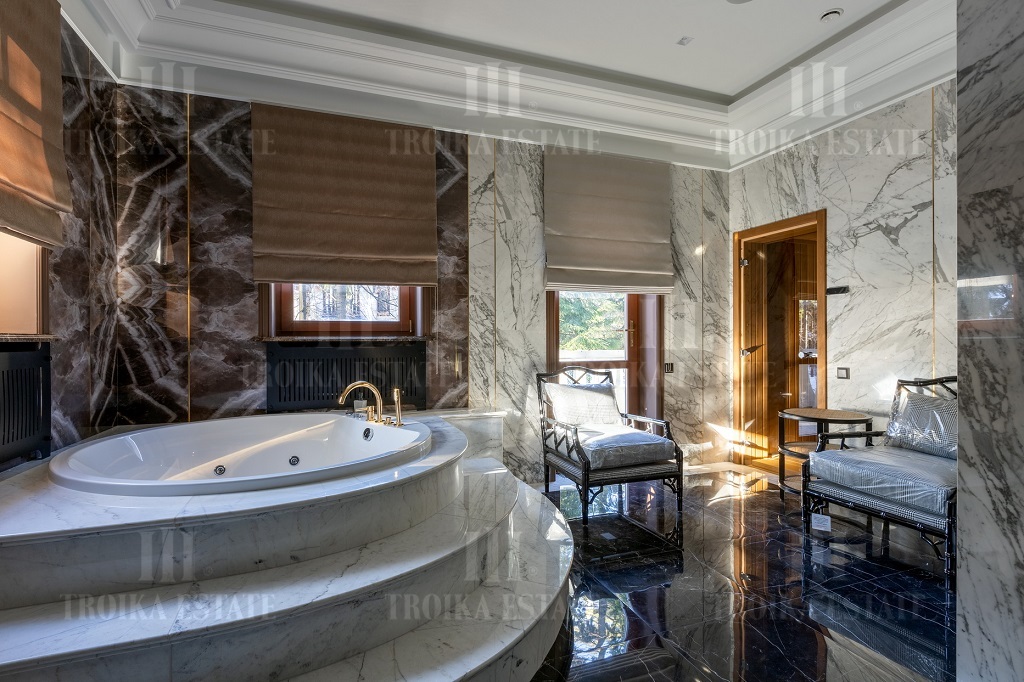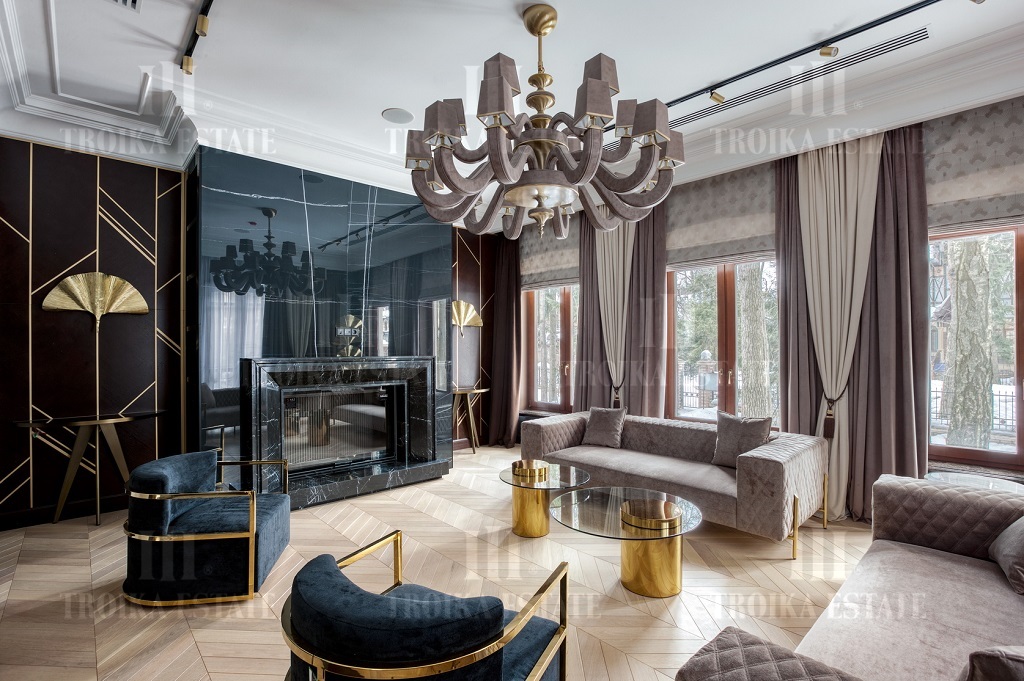 Новый дом, полностью готовый к проживанию. Дизайнерская отделка в стиле современная классика включает мебель, полностью оборудованные санузлы и кухню. В доме 3 жилых уровня. Предусмотрен гараж на 2 м/м. Планировка дома включает большую гостиную с камином, столовую, кухню, 5 спален с ванными и гардеробными, кабинет.