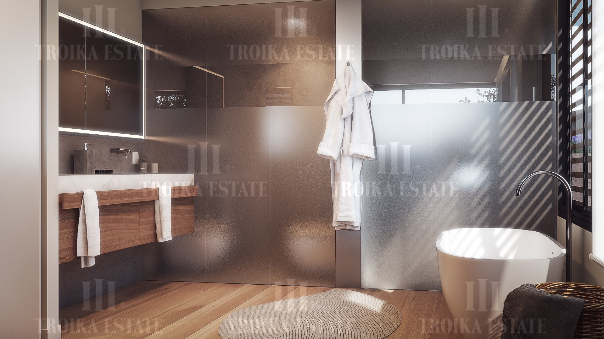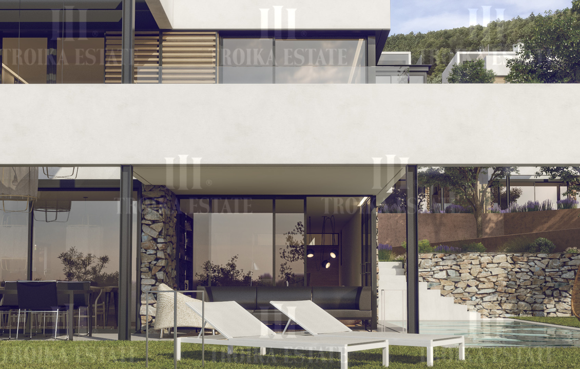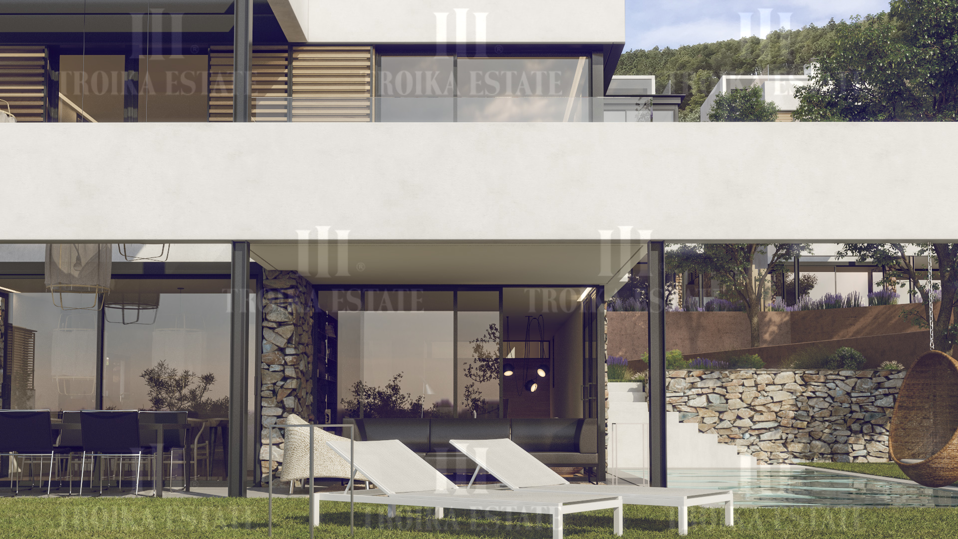 Вилла в современном стиле на охраняемой территории поселка. В дворе бассейн (2,75х8м). За счет оригинального рельефа земельного участка дом обладает уникальными видовыми характеристиками. Особое внимание создатели проекта уделили приватным территориям - они спланированы таким образом, что у будущего владельца будет абсолютно обособленный придомовый участок, спрятанный от посторонних глаз.